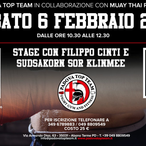 Padova Top Team in collaborazione con Muay Thai Padova SABATO 6 FEBBRAIO 2016 Dalle ore 10,30 alle ore 12,30 L’esperienza e la professionalità di Filippo Cinti gli hanno permesso di essere scelto da campioni come sudsakorn, buakaw, saenchai ed altri giovani fighter che combattono al lumpinee,...